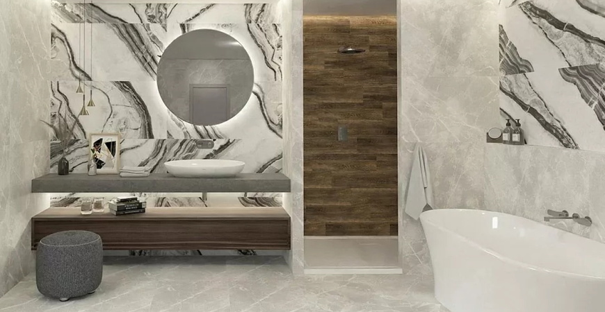 Керамогранит – это универсальная история и для стен, и для пола. Современное оборудование для резки и качественный клей позволяют достаточно легко с ним работать, а также получить изделия крупного формата.