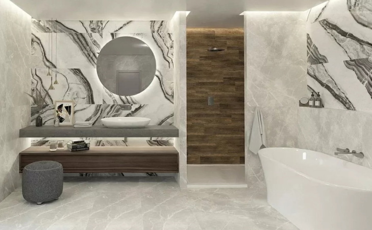Керамогранит – это универсальная история и для стен, и для пола. Современное оборудование для резки и качественный клей позволяют достаточно легко с ним работать, а также получить изделия крупного формата.
